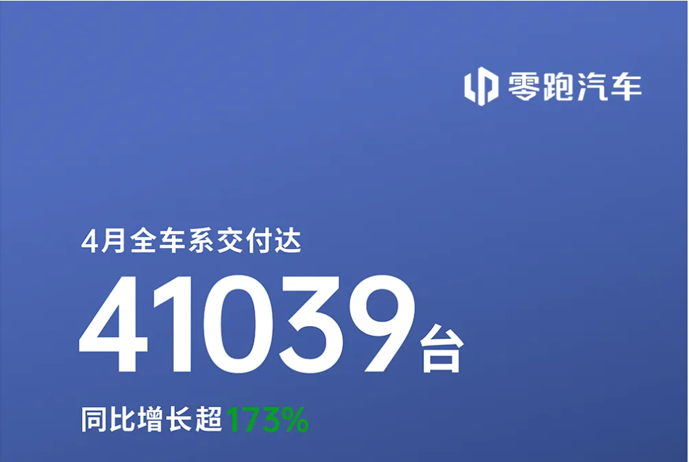 4月,零跑汽车月度交付量站上4万辆大关,达41039辆,与其他造车新势力拉开差距。