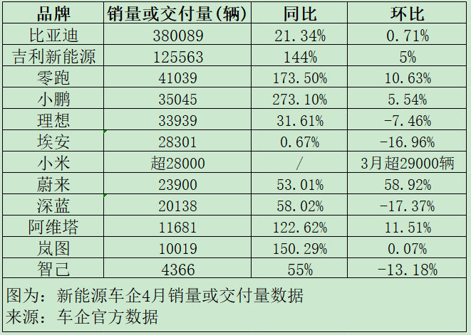 具体来看,4月,零跑汽车月度交付量首次站上4万辆大关,小鹏汽车、理想汽车守住3万辆关口,成为新能源车企头部阵营的重要成员。