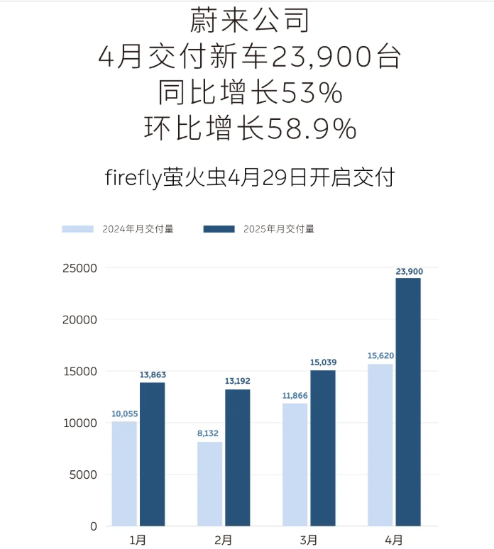 4月,蔚来公司的交付量迈过2万辆关口,达2.39万辆,同比增长53.01%,环比增长58.92%。